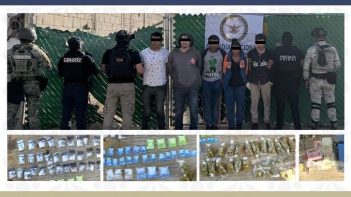 Durante la diligencia, fueron detenidos Juan N., Juan José N., José N., Daniel N., Miguel N. y Guadalupe N., en posesión de 61 envoltorios con sustancia granulada de color blanco con características similares al narcótico conocido como cristal, 29 envoltorios con hierba verde con características propias de la marihuana y dinero en efectivo.