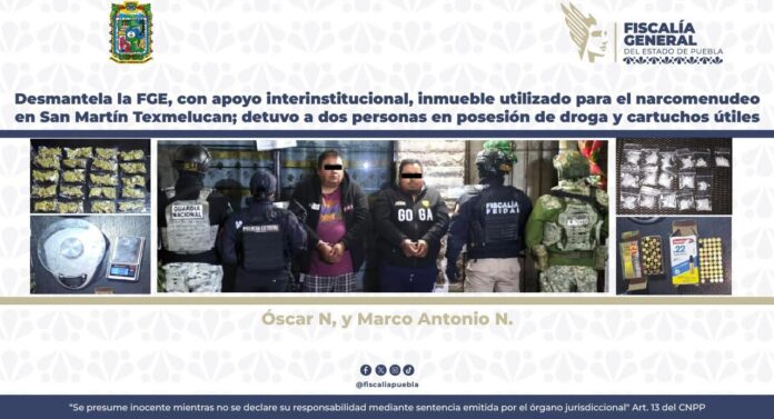 La Fiscalía General del Estado implementó, con apoyo interinstitucional, acciones operativas en San Martín Texmelucan, logrando desmantelar un inmueble utilizado para actividades de narcomenudeo; además, detuvo en el lugar a Óscar N. y Marco Antonio N., presuntamente en posesión de diversas dosis de estupefacientes y cartuchos útiles.