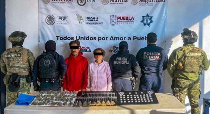 TEHUACÁN, Pue.- Derivado del reforzamiento de las labores para combatir la distribución de sustancias ilícitas, la Secretaría de Seguridad Pública (SSP), en coordinación con la Secretaría de Marina (SEMAR) y la Policía Municipal de Tehuacán, detuvo a una pareja de presuntos narcomenudista.